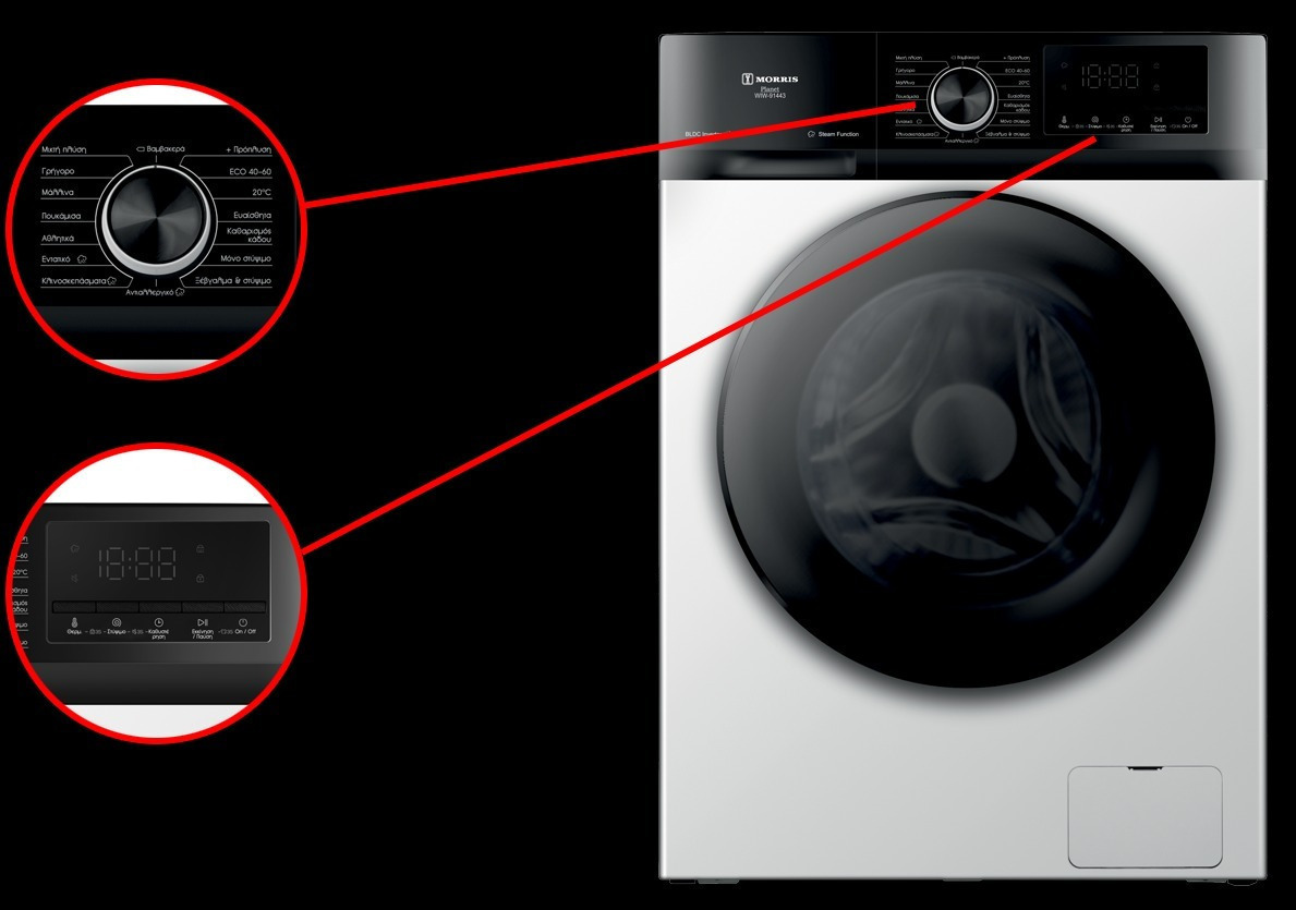 • Ηλεκτρονικός Έλεγχος Λειτουργίας: Οθόνη LED για εύκολη παρακολούθηση του υπόλοιπου χρόνου πλύσης.